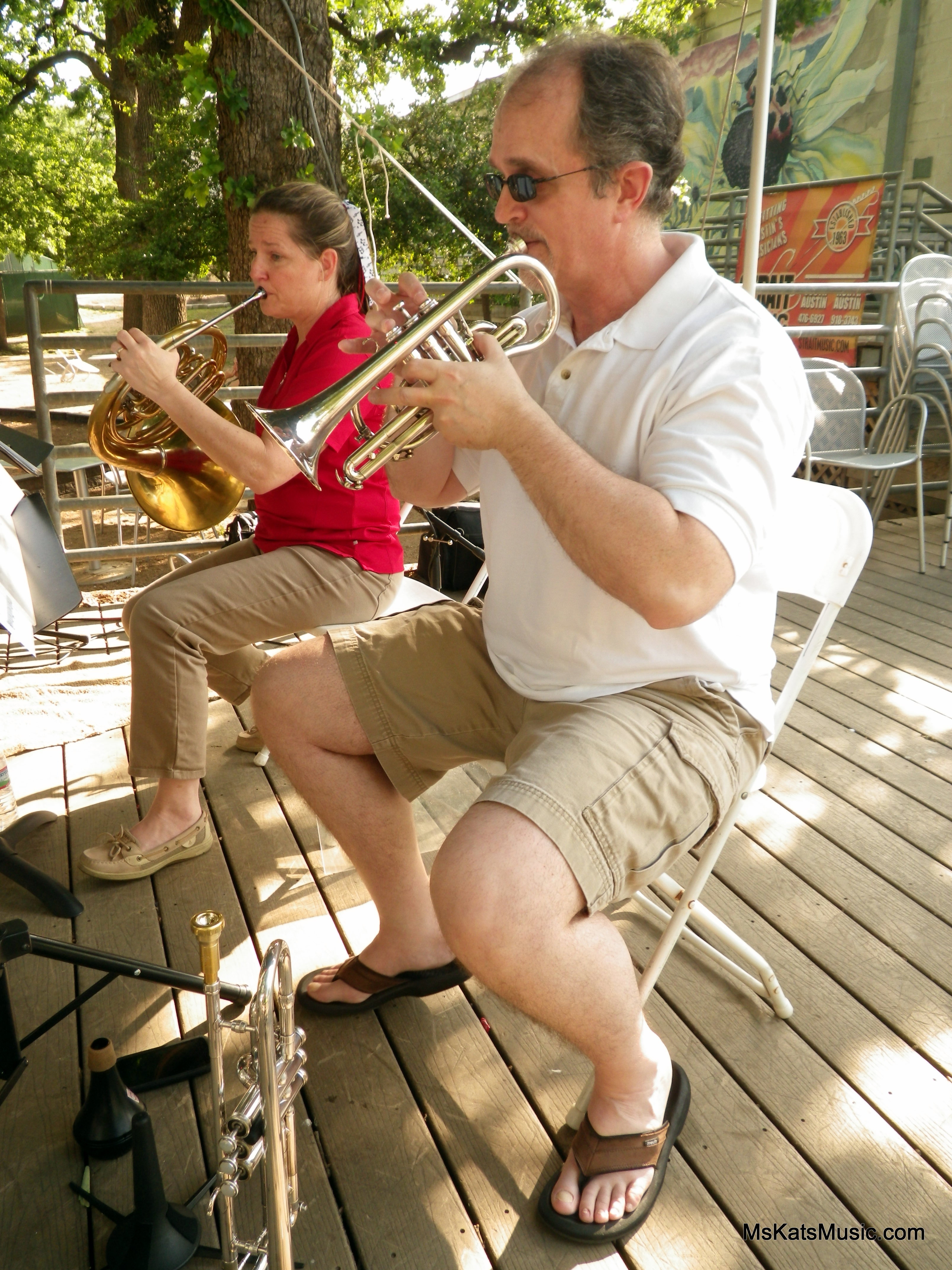 The Texas Community Music Festival is hosted by the Austin Civic Wind Ensemble, and Pecan Street Brass boasts the membership of ACWE conductor and Artistic Director Robert Laguna. (Who, incidentally, is another kid-magnet. He had a small flock of pint-sized groupies sitting under his trumpet bell for a good portion of the show.)