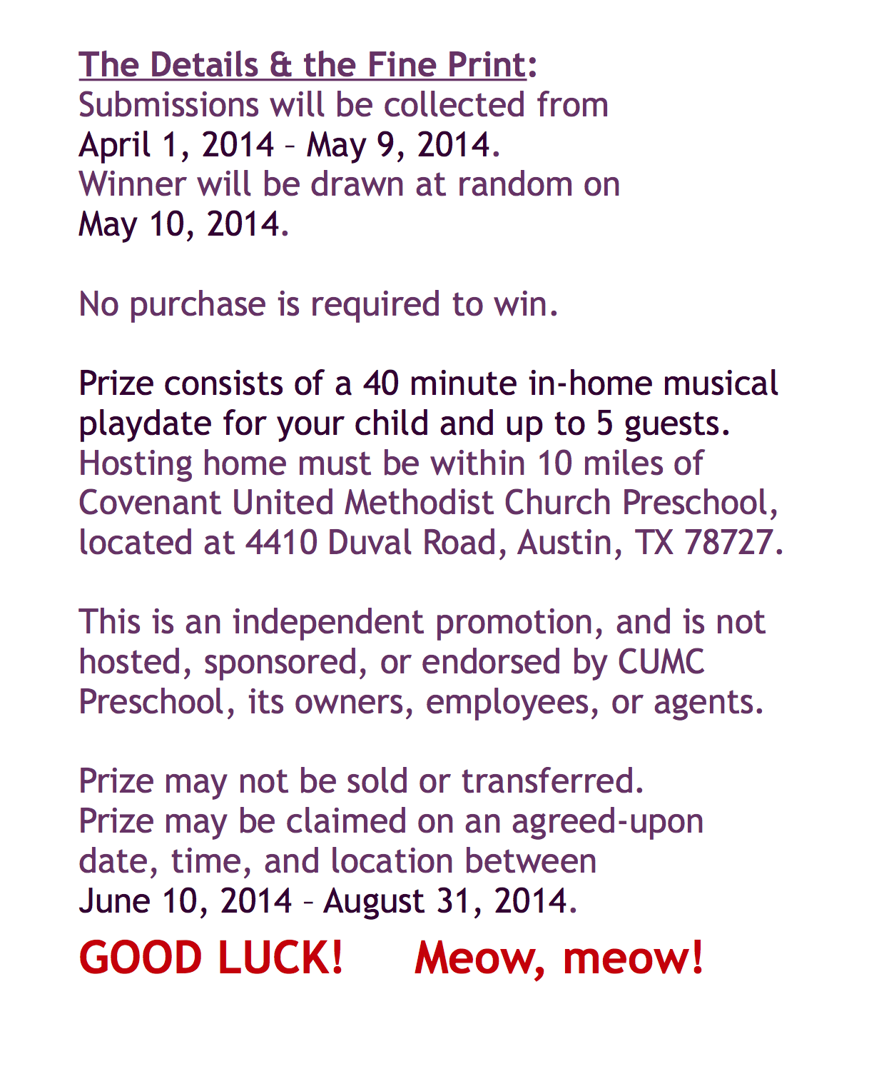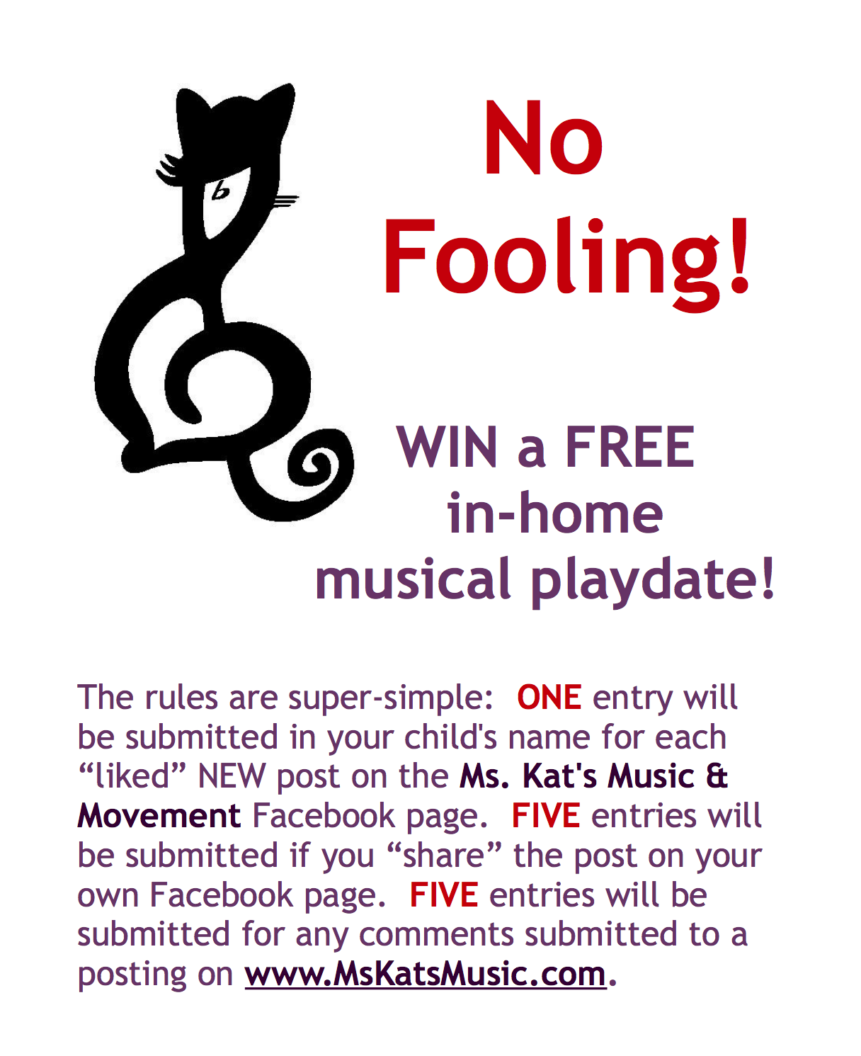Tomorrow at 12pm (CST) I’ll be posting the winner of the FREE, in-home musical play date! You have until 10pm tonight to “Like” and “Share” Facebook posts dating back to April 1, 2014, and to add your questions and comments* to ALL posts here on http://www.MsKatsMusic.com